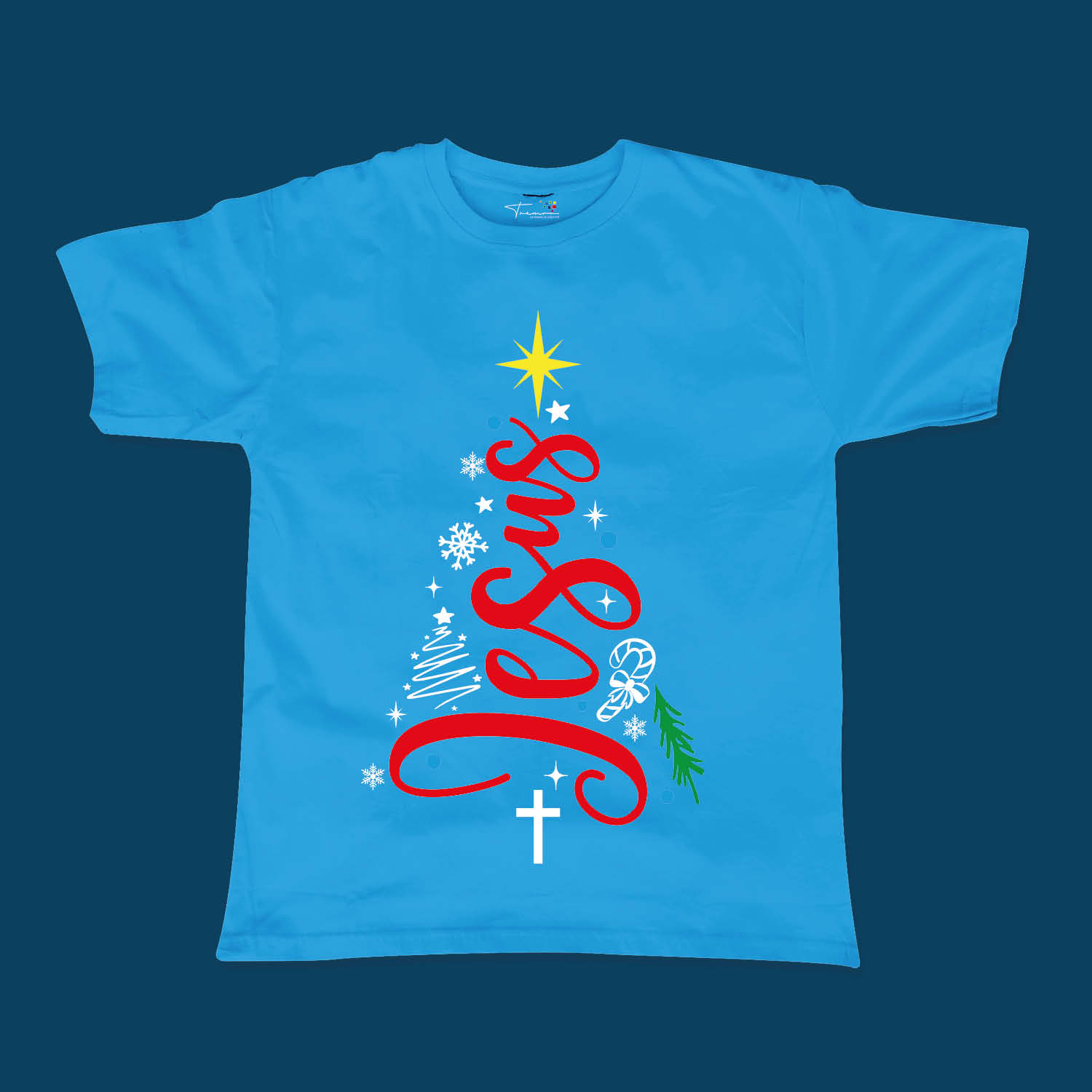 Un design unique pour célébrer la naissance du Sauveur. Affichez l’essentiel de Noël avec ce t-shirt élégant où la calligraphie du nom “Jésus” dessine un magnifique sapin de Noël.