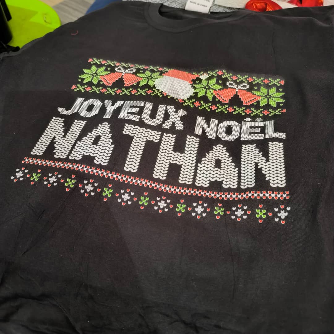 Fêtez Noël avec une touche unique ! 🎅 Plongez dans l’ambiance des fêtes sans sacrifier votre confort. Ce t-shirt au design “pull moche” (ugly sweater) revisité est entièrement personnalisable avec votre prénom/nom/surnom.
